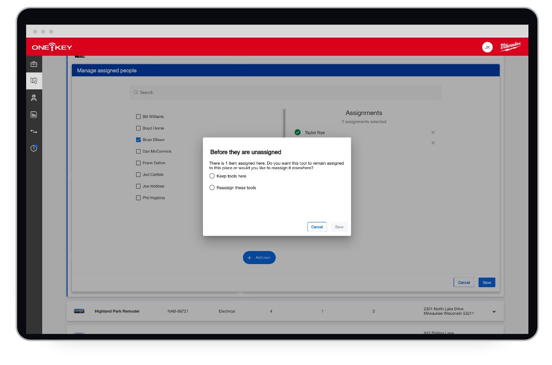 When a job ends, you might delete it from your One-Key web account, to help declutter your Places’ inventory. On the other hand, you might want to reassign a team member, based on the needs at another jobsite, or remove an employee that has left your organization. If tools are not transferred from your team member before removing them from a job, these tools can become unassigned. This can decrease visibility to these tools.